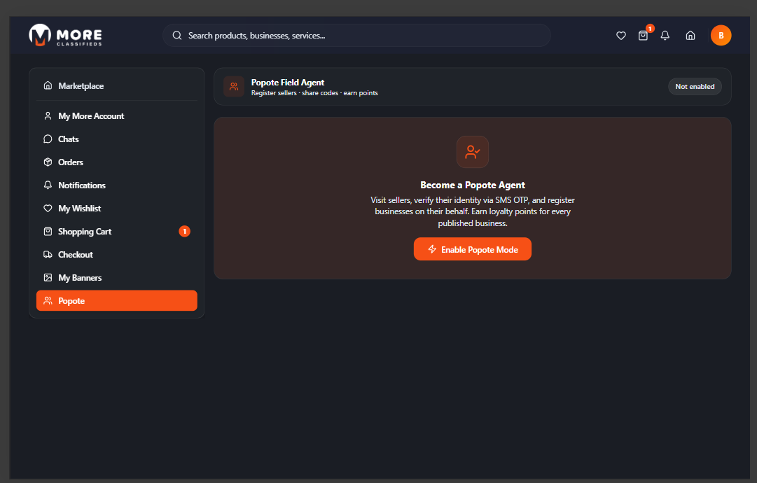 Popote is More Classifieds' field agent programme. As a Popote agent you visit businesses, verify their identity via SMS OTP, register their business on the platform, and earn loyalty points for every business that successfully publishes.